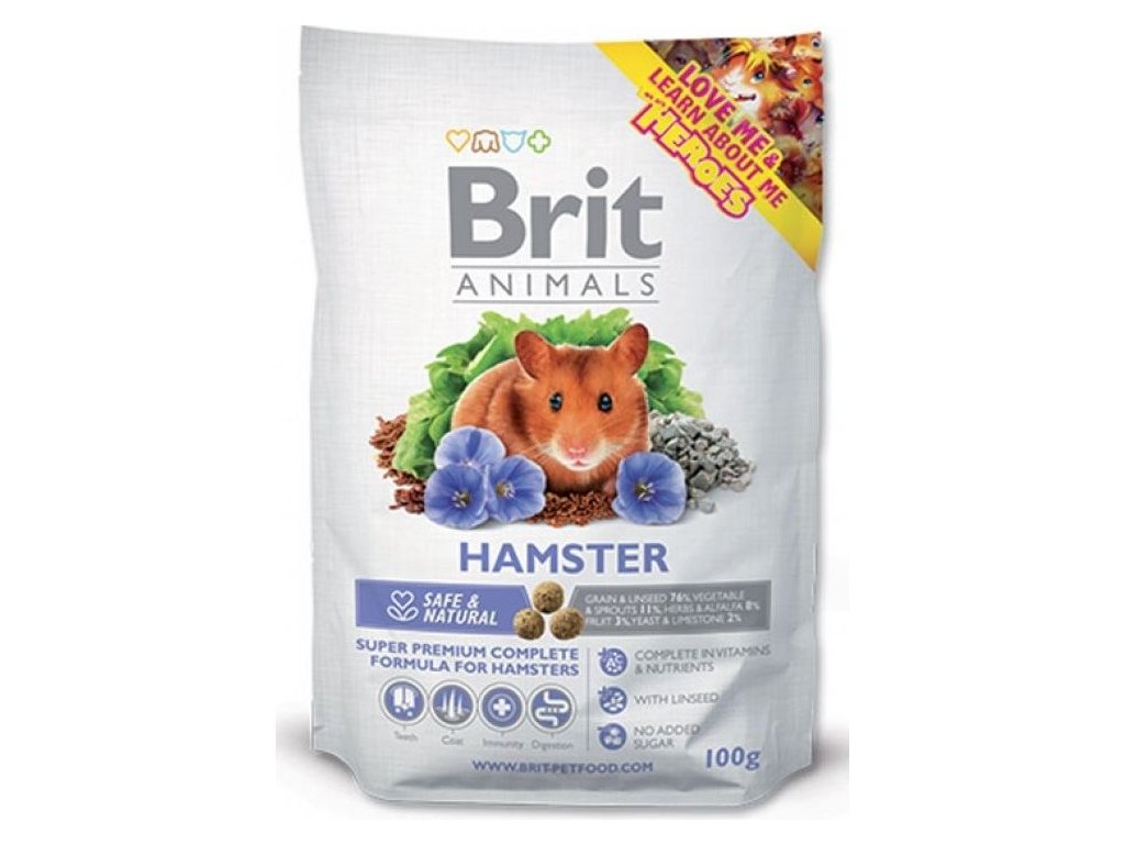 Brit Animals Hamster Complete je superprémiové kompletní krmivo pro křečky. S kompletním obsahem potřebných vitamínů a minerálů. Obsahuje lněné semínko jako zdroj omega-3 nenasycených mastných kyselin pro zdravou srst.