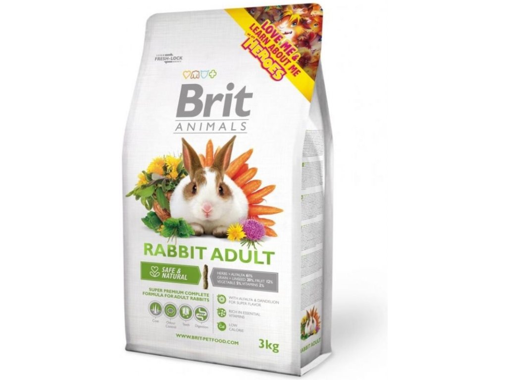 Brit Animals Rabbit Adult Complete je superprémiové kompletní krmivo pro dospělé králíky (20 týdnů až 4 roky). Optimální poměr proteinu, tuku avlákniny zajištuje ideální stravitelnost avýživovou hodnotu krmiva pro období dospělosti. Ostropestřec mariánský podporuje správnou funkci jatera působí jako prevence nejčastěj- ších onemocnění metabolického původu. Kompletní obsah vitamínů a živin provitalitu a skvělou kondici.