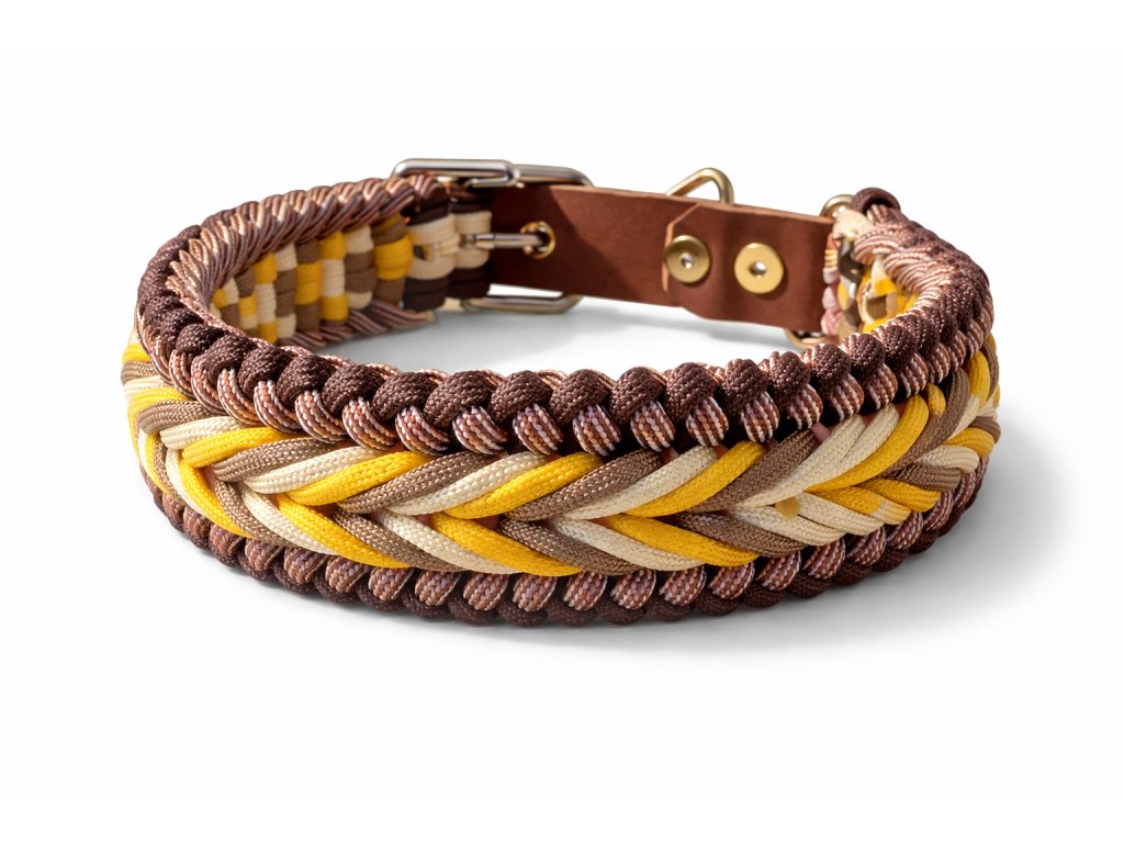 Honey je výrazný a originální obojek pro psy, kteří si zaslouží být vidět. Ručně pletený z kvalitního paracordu v tónech žluté a hnědé zaujme svou originalitou a propracovaností.