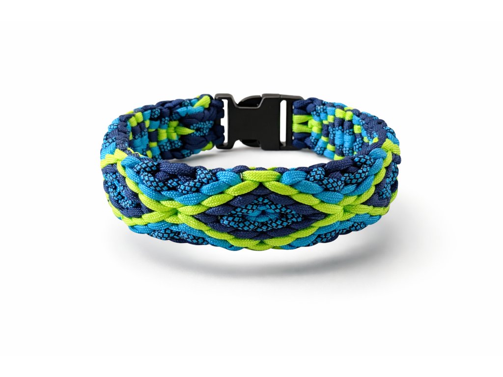 Modrozelená laguna je výrazný a originální obojek pro psy, kteří si zaslouží být vidět. Ručně pletený z kvalitního paracordu v tónech syté modré, mořské tyrkysové, námořnické a limetkově zelené zaujme nejen svou barevností, ale i propracovaným vzorem připomínajícím vodní vír.